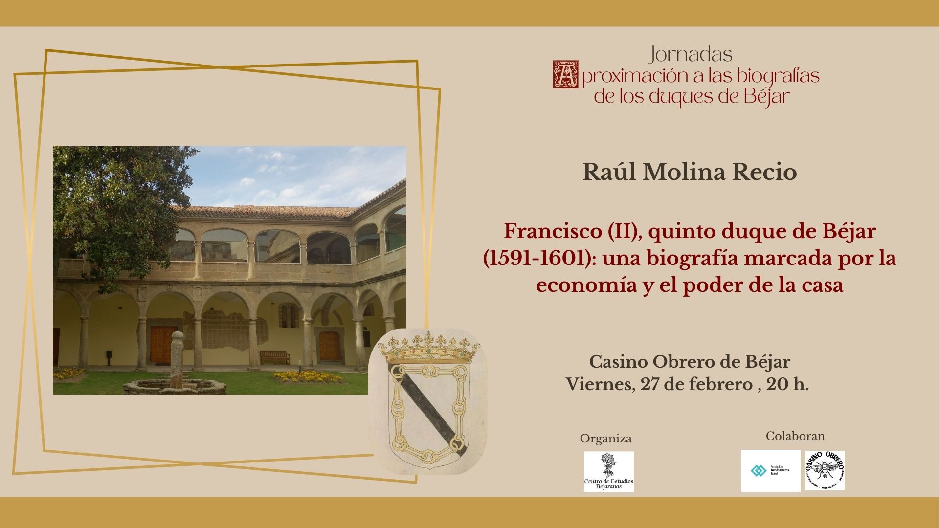 El viernes 27 de febrero será el turno de Raúl Molina Recio con una charla titulada “Francisco (II), quinto duque de Béjar (1591-1601): una biografía marcada por la economía y el poder de la casa”. Será a las 20 horas en el Casino Obrero de Béjar.