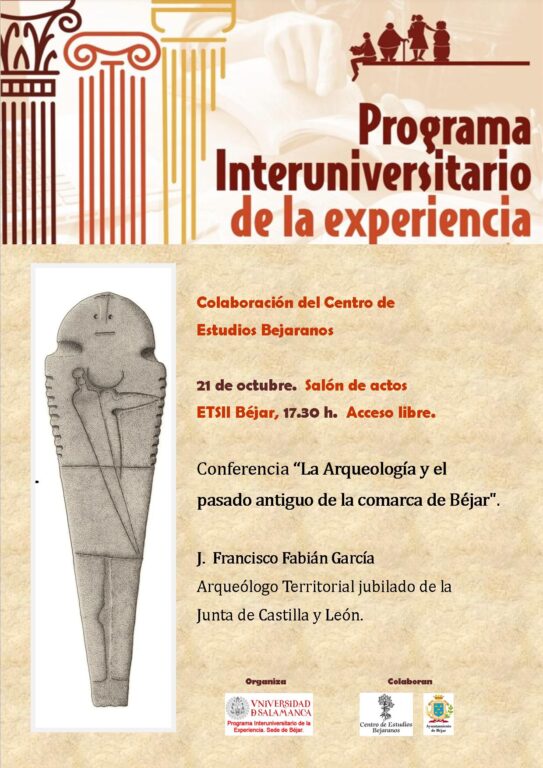 El martes 21 de octubre, a las 17.30 horas, tendrá lugar la conferencia de J. Francisco Fabián García, miembro del CEB y arqueólogo territorial jubilado de la Junta de Castilla y León, “La Arqueología y el pasado antiguo de la comarca de Béjar”.