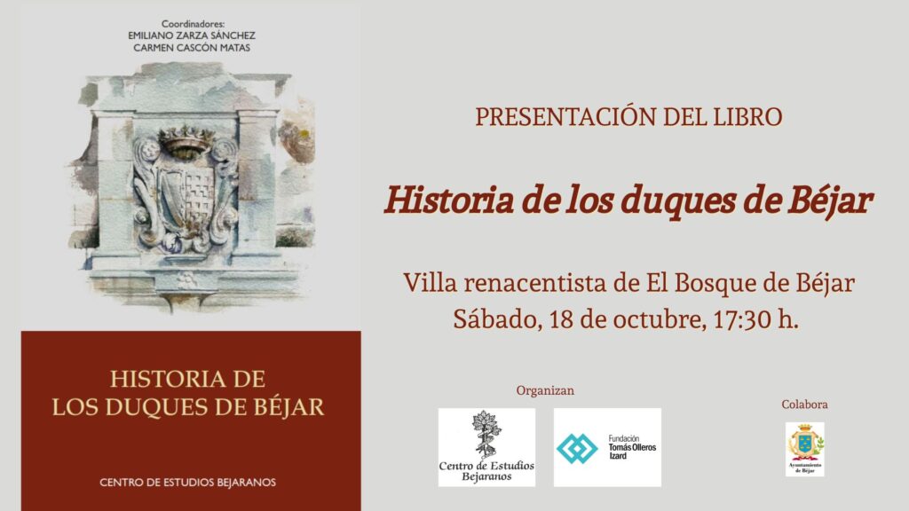 El Centro de Estudios Bejaranos tiene el placer de anunciar la presentación del libro Historia de los duques de Béjar el sábado, 18 de octubre de 2025, a las 17.30 horas en la villa renacentista de El Bosque de Béjar.
