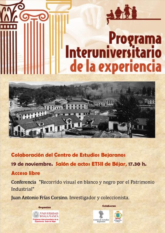 El miércoles día 19 de noviembre continuamos con la colaboración con la Universidad de la Experiencia en su sede de Béjar con la conferencia de nuestro compañero Juan Antonio Frías Corsino “Recorrido visual en blanco y negro por el Patrimonio Industrial”.