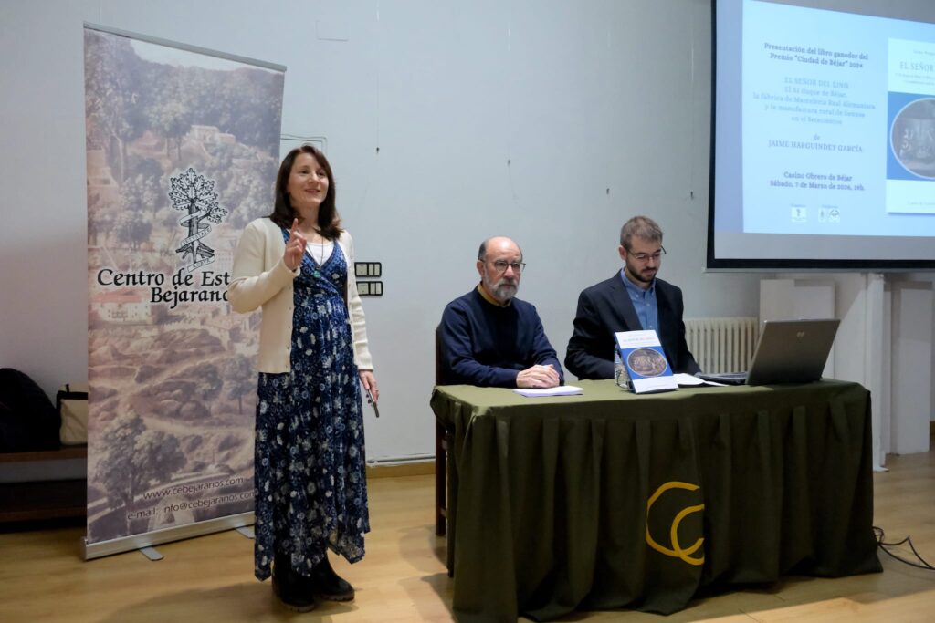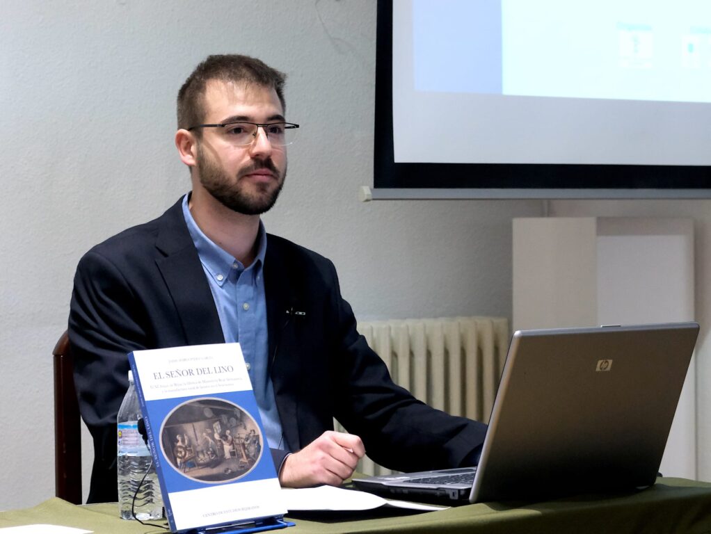 Tras esta breve presentación, el investigador y miembro del Centro Javier Ramón Sánchez Martín intervino para destacar la gran calidad del trabajo de Jaime Harguindey García y su juventud, una obra que fue declarada ganadora por unanimidad del jurado convocado al efecto. Además ofreció unas pinceladas de la novedad historiográfica que supone este libro centrado en la manufactura del lino, en una panorama investigador focalizado en la industria textil lanera tradicional en la ciudad de Béjar. Por otro lado, desgranó algunas características técnicas de ambos procesos textiles y sus diferencias, e incidió en el peculiar interés del XI titular de Béjar, Juan Manuel II, por el impulso de estas y otras manufacturas en sus estados, un interés que provenía de sus antepasados desde que el V titular construyó el Tinte del Duque y obligó a todos los fabricantes a tintar sus paños en él cobrando un impuesto.