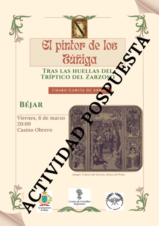 La conferencia prevista para mañana 6 de marzo,titulada “El pintor de los Zúñiga” a cargo de Charo García de Arriba, ha sido pospuesta.