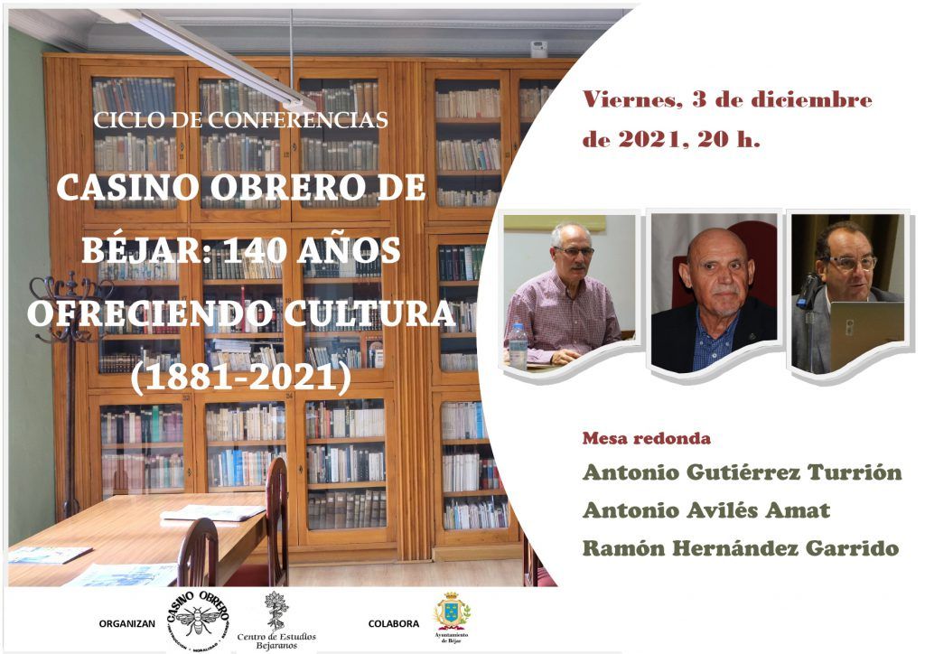 Una mesa redonda entre tres expresidentes del Casino Obrero y miembros del Centro de Estudios Bejaranos, Antonio Avilés Amat, Antonio Gutiérrez Turrión y Ramón Hernández Garrido, tendrá lugar el viernes 3 de diciembre. La charla girará en torno a sus vivencias en torno al Ateneo Cultural. El acto tendrá lugar en el salón de actos y exposiciones a las 20 horas.